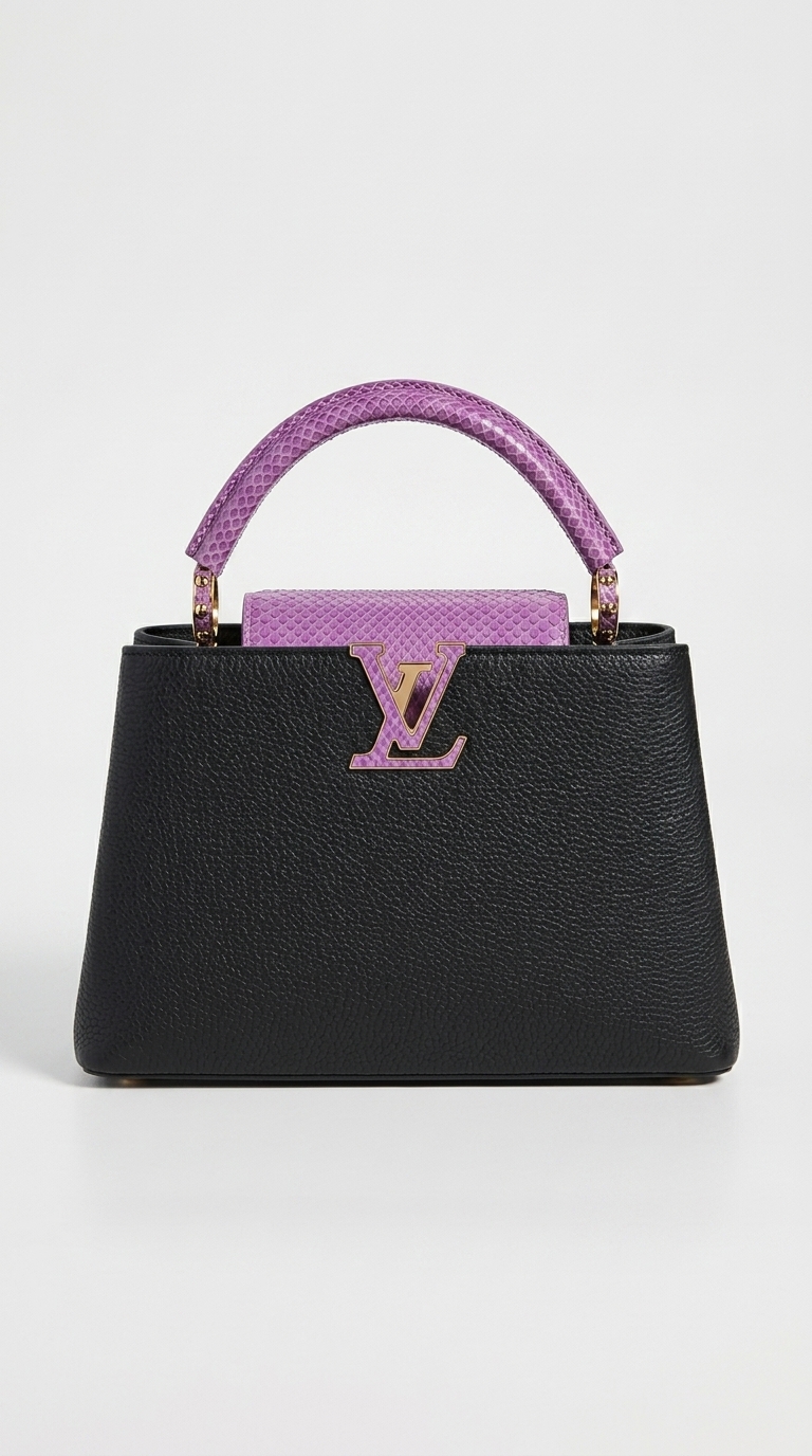Confeccionado en piel Taurillon granulada de color negro profundo, destaca por sus exquisitos acabados en piel de pitón de color lila en el asa superior, la solapa y el emblemático cierre LV. Su diseño versátil permite llevar la solapa por fuera, mostrando la flor del Monogram, o por dentro para revelar las iniciales de Louis Vuitton. Una pieza de colección diseñada para la mujer que busca exclusividad y un contraste de texturas inigualable.