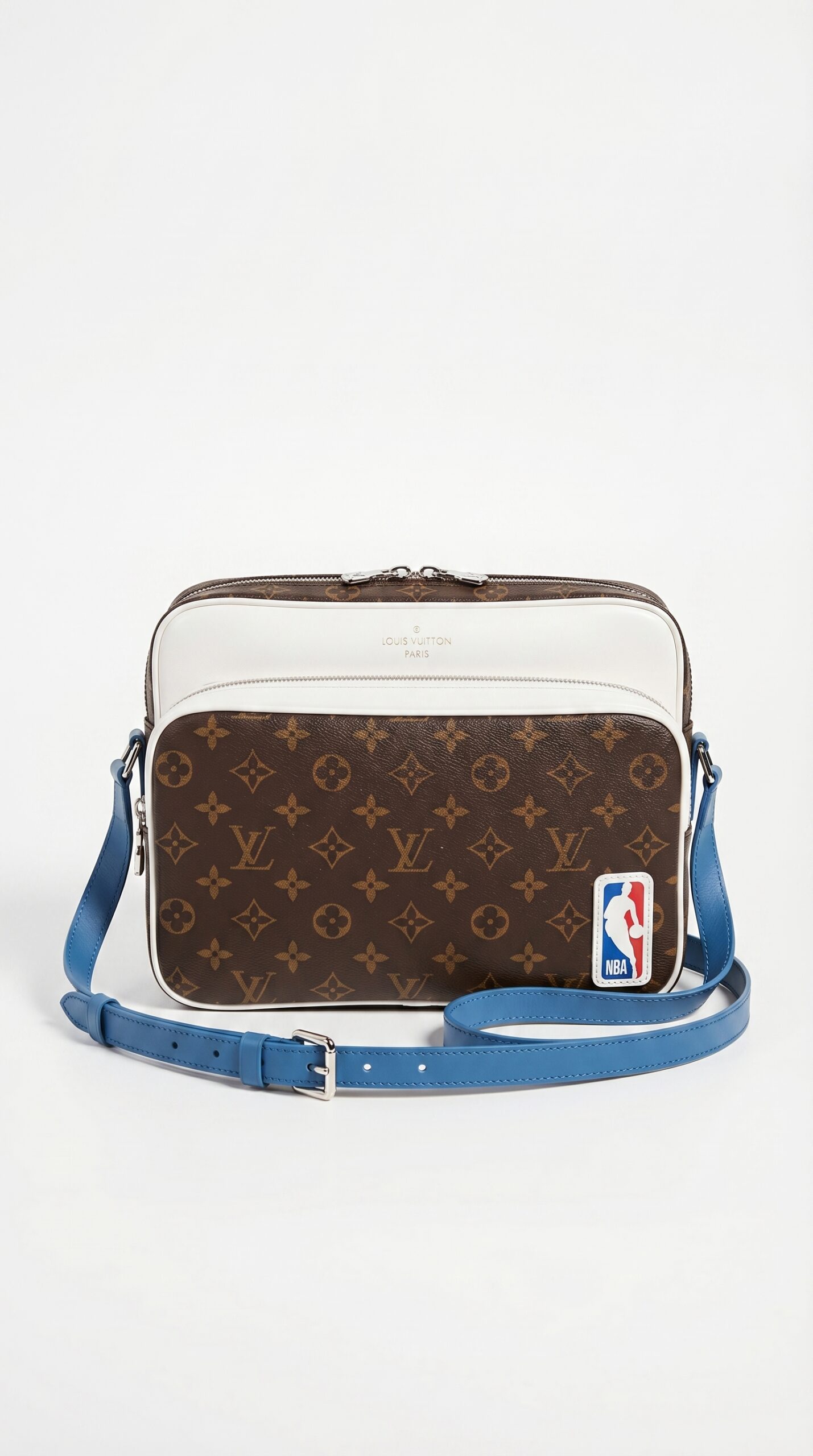 Confeccionado en la icónica lona Monogram, destaca por sus audaces paneles laterales en piel blanca y su correa ajustable en azul vibrante, evocando los colores de la liga. El detalle protagonista es el parche de cuero con el logo oficial de la NBA, que sella esta colaboración histórica.